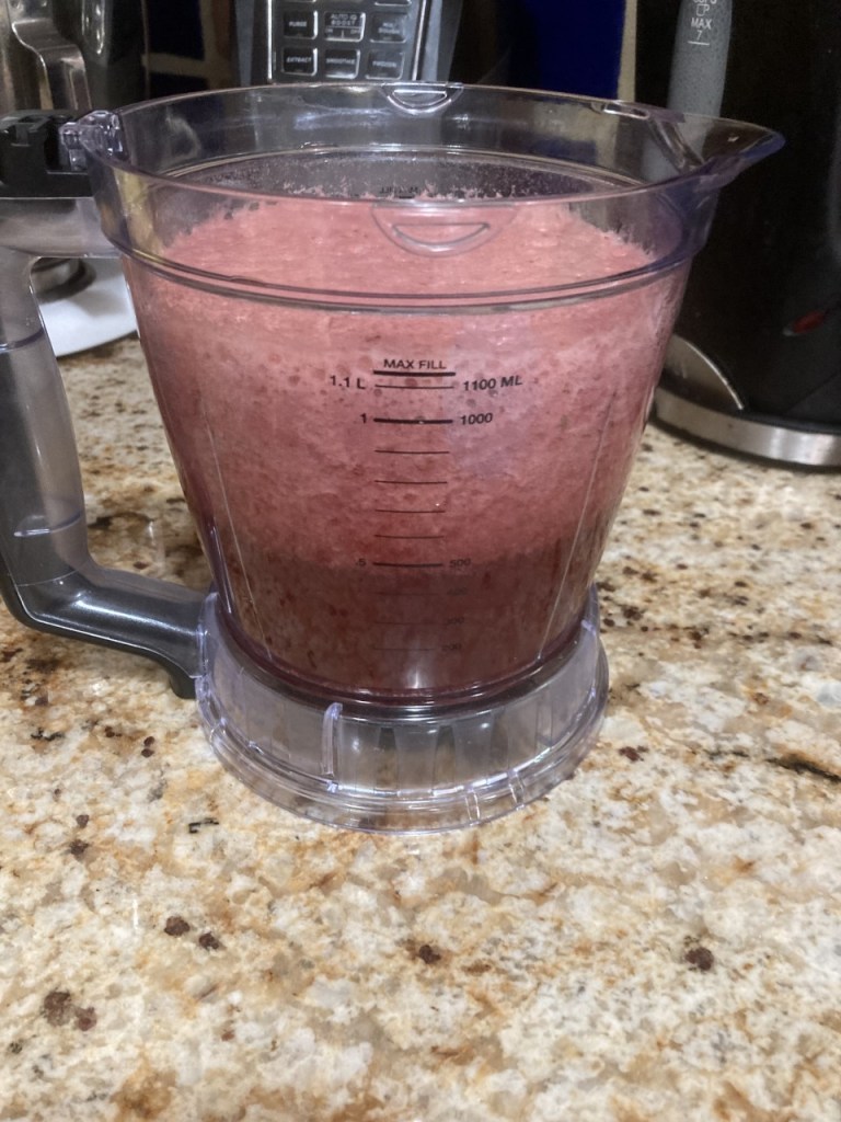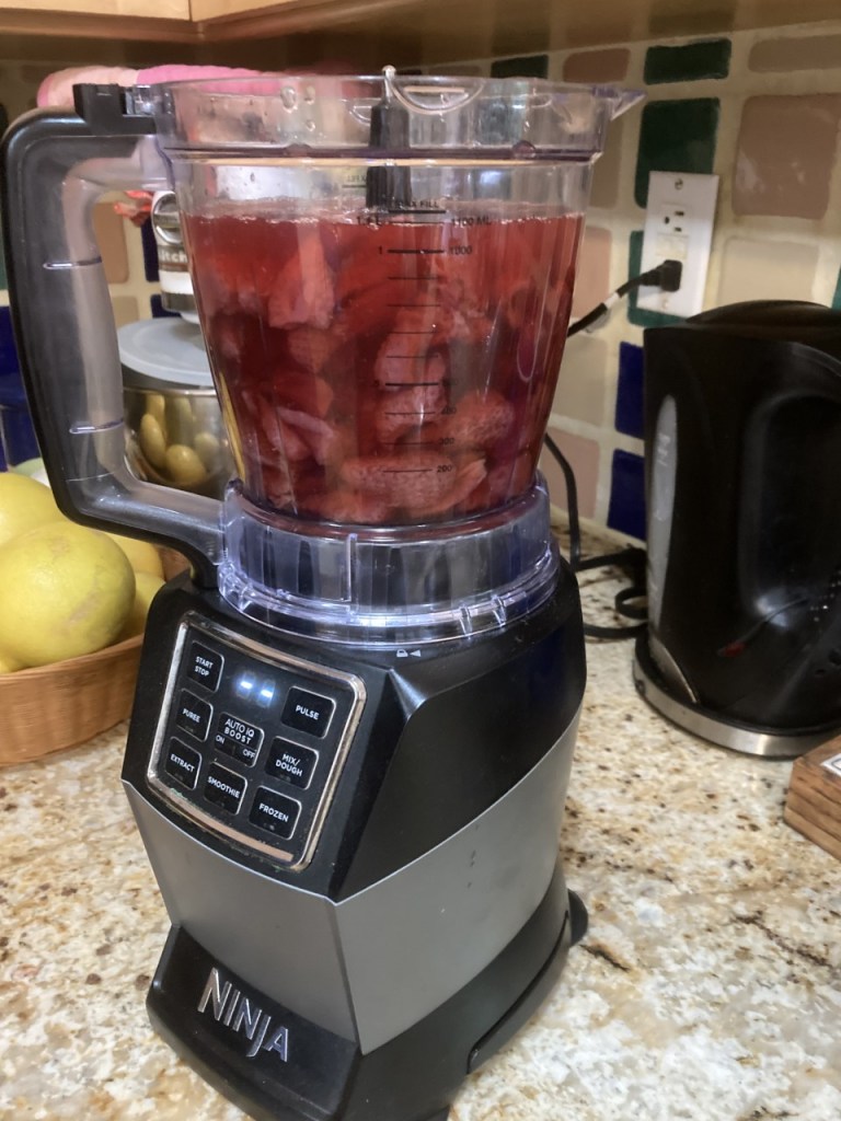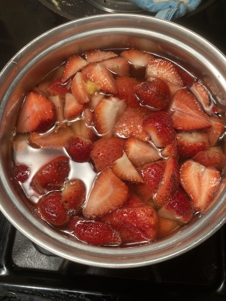 The other day I came home with a box of lovely strawberries just on the verge of being overripe. They really could not sit in the fridge waiting for the family to decide to eat them. I remembered that Constant Companion enjoyed a cold strawberry soup.* They were washed, cut up and with a handful of berries that had sat almost too long in the fridge placed in a medium saucepan. All were covered with liquid – about ¼ cup of orange juice, squeezed from a small orange, also on the verge, ½ cup of prosecco from an open bottle, and water totaling two cups. Please note, no sugar was added. Our family have come to prefer the taste of fruit unmasked by sweeteners. Also, no dairy due to CC’s aversion to dairy.