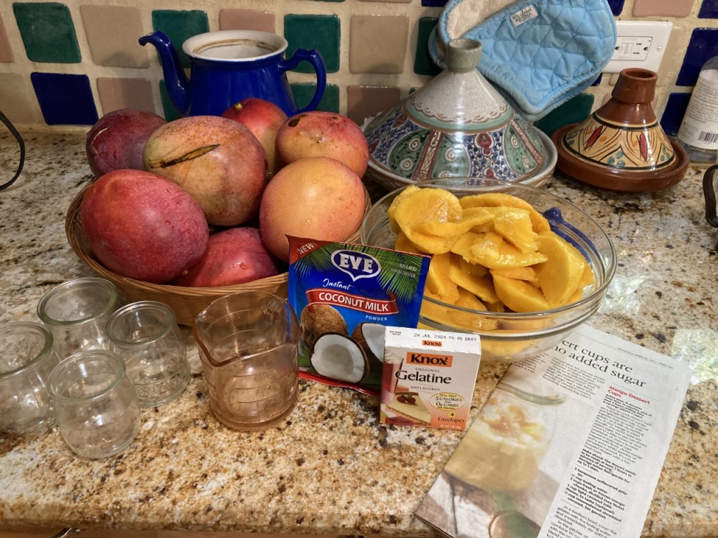 This recipe for Mango Dessert Cups appeared recently in the local newspaper. Because our mangos were exceptionally sweet, I did not add sugar. The result is a light dessert with a delicate aftertaste of mango: https://www.washingtonpost.com/food/2022/03/31/mango-dessert-cups-recipe/