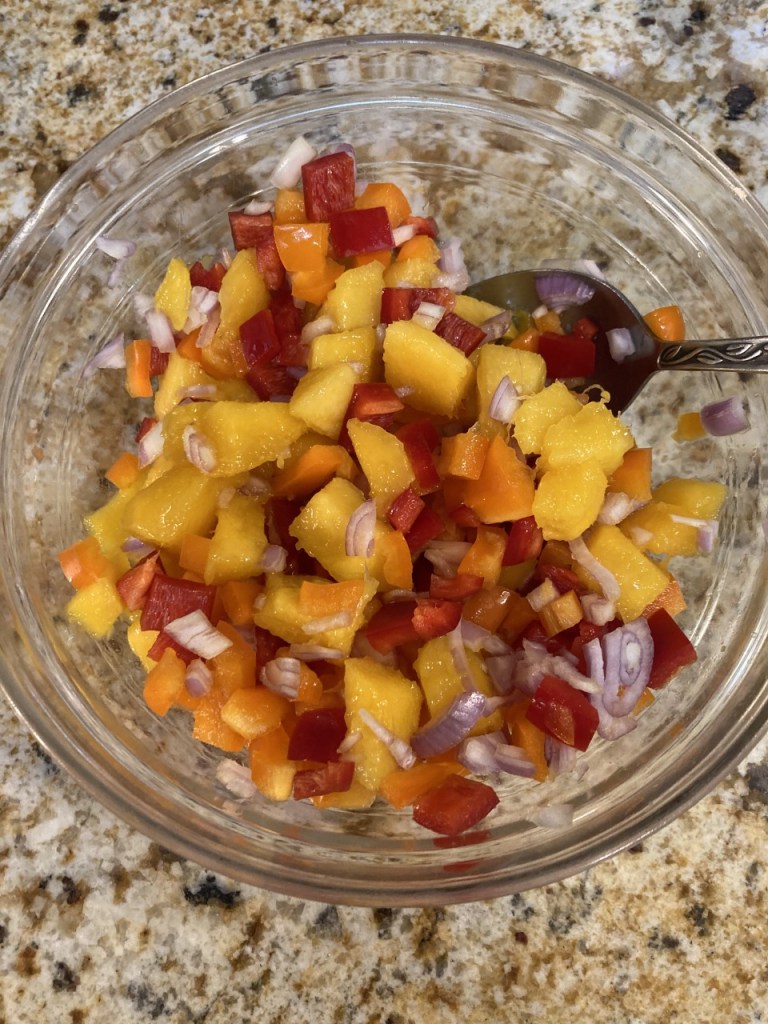 Many years ago I came up with a sweet, chunky accompaniment for fish or chicken. I made it again with the current batch of mangos.