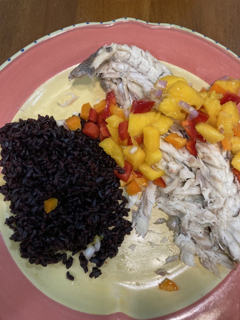 Simply peel and dice mango, try to use pieces that are move firm. Dice some red, yellow, and/or orange sweet peppers. Add diced red onion; I used shallots this time for a more delicate flavor. If you enjoy spice, add some diced jalapeno. We enjoyed it over cold broiled branzino, a particularly sweet fish, with black rice.