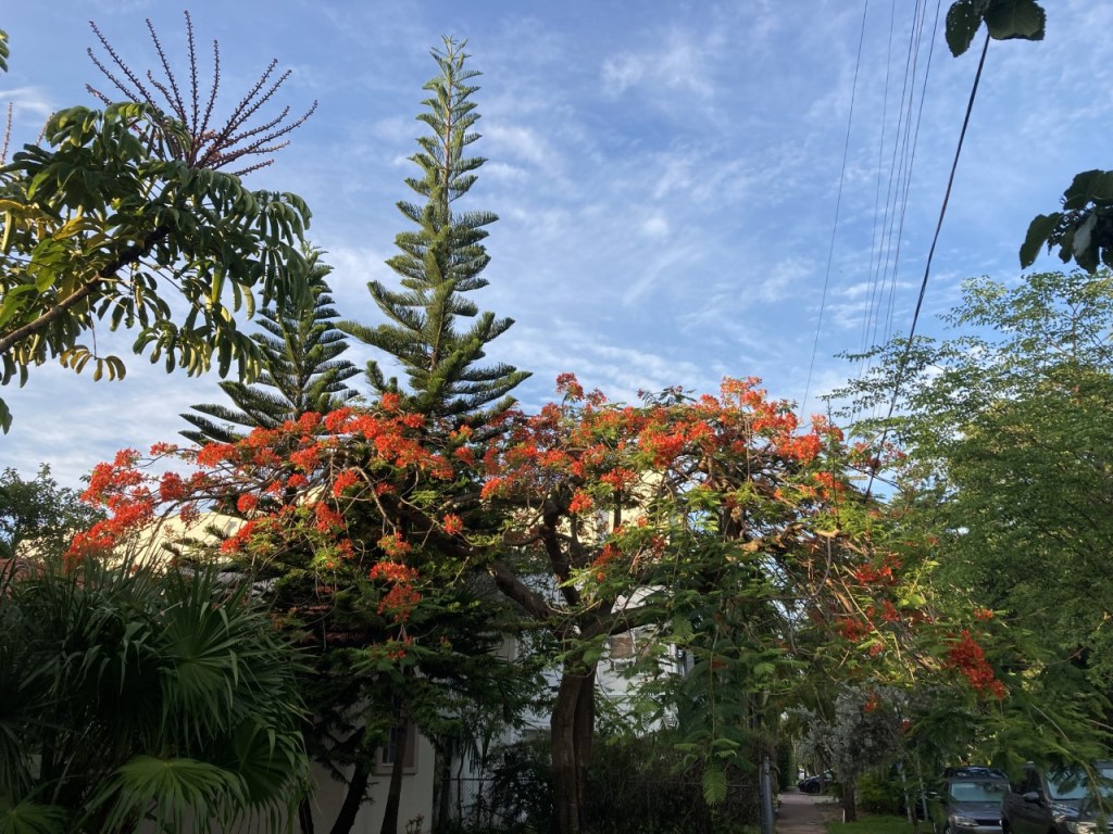 The flaming blooms of the Poinciana trees are one sign of the arrival of summer. This year they seem to be short-lived, quickly being overtaken by the spreading of the green. Their beauty is still striking.