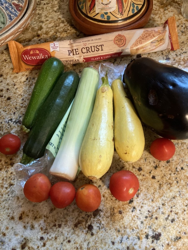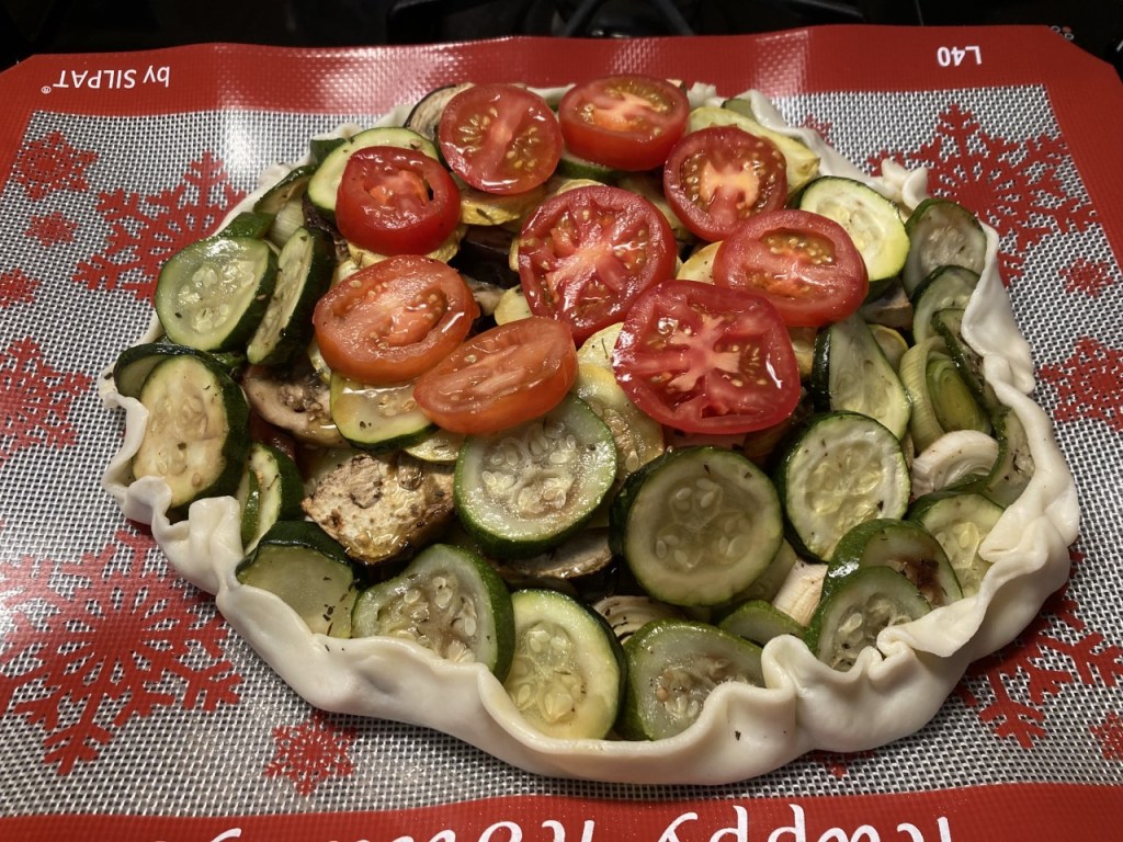 Open a pie crust (I do not make my own, you can). Distribute the roasted vegetables in a circular pattern according to your own aesthetics. Add thinly sliced tomatoes. Top with a spray of olive oil and bake for about an hour in the moderate oven.