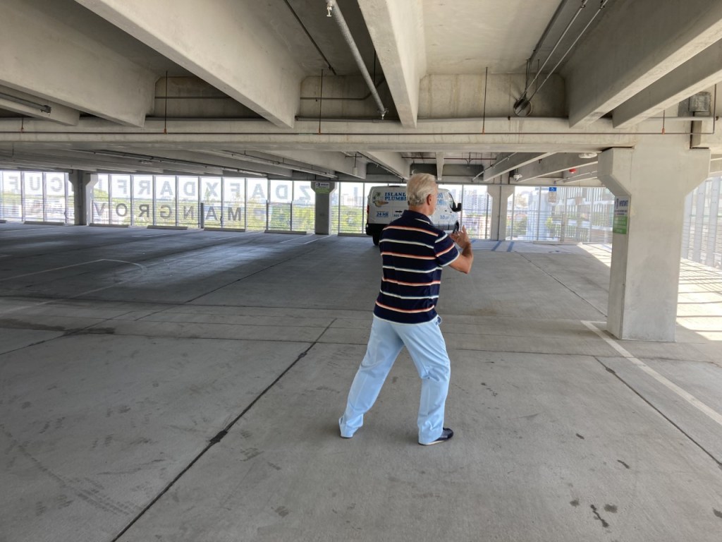 *In case you wonder, this summer the centers where the senior tai chi class is normally held are taken over by kids in summer camp. Our class met for the past three months on the 6th floor of a city parking garage. In the background you might make out the backward word “Mangrove” part of a public art installation on the garage. A view from the garage is our beach on Atlantic Ocean. Speaking of being out-of-control, my best intentions were to add a stop at the beach right after class. I did only twice.