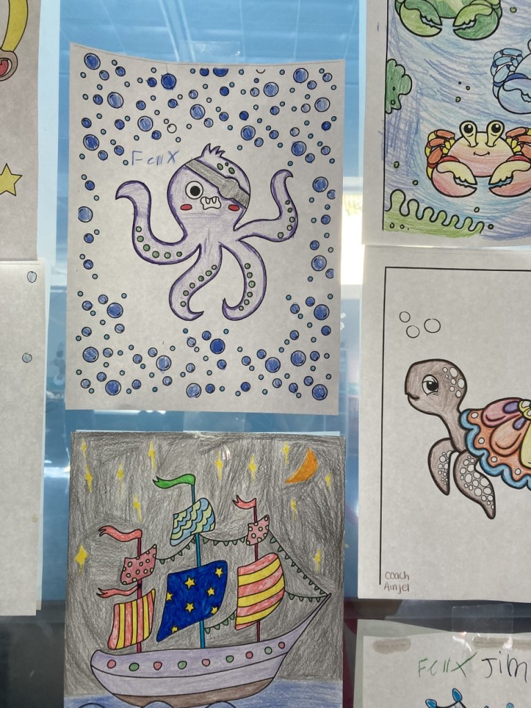 Our group enjoyed an fun-filled evening at the local children’s museum. A giant two-story abstract sand castle purported to represent the beginning of the voyage of adventure and imagination is front and center upon entering. It was designed by local artist Carlos Alva in collaboration with school children who made sea creatures out of clay. Who was responsible for this very happy octopus?