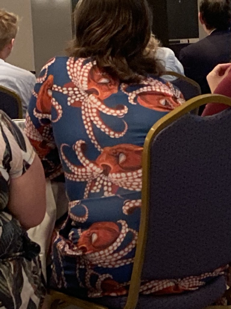 In the last month or so, the doors opened and Hotel California was left behind. Who would have thought so many octopi would be out there? At a recent meeting of museum professionals from all over Florida, one woman wore a dress covered by the eight-legged wonders, just swimming across the field.