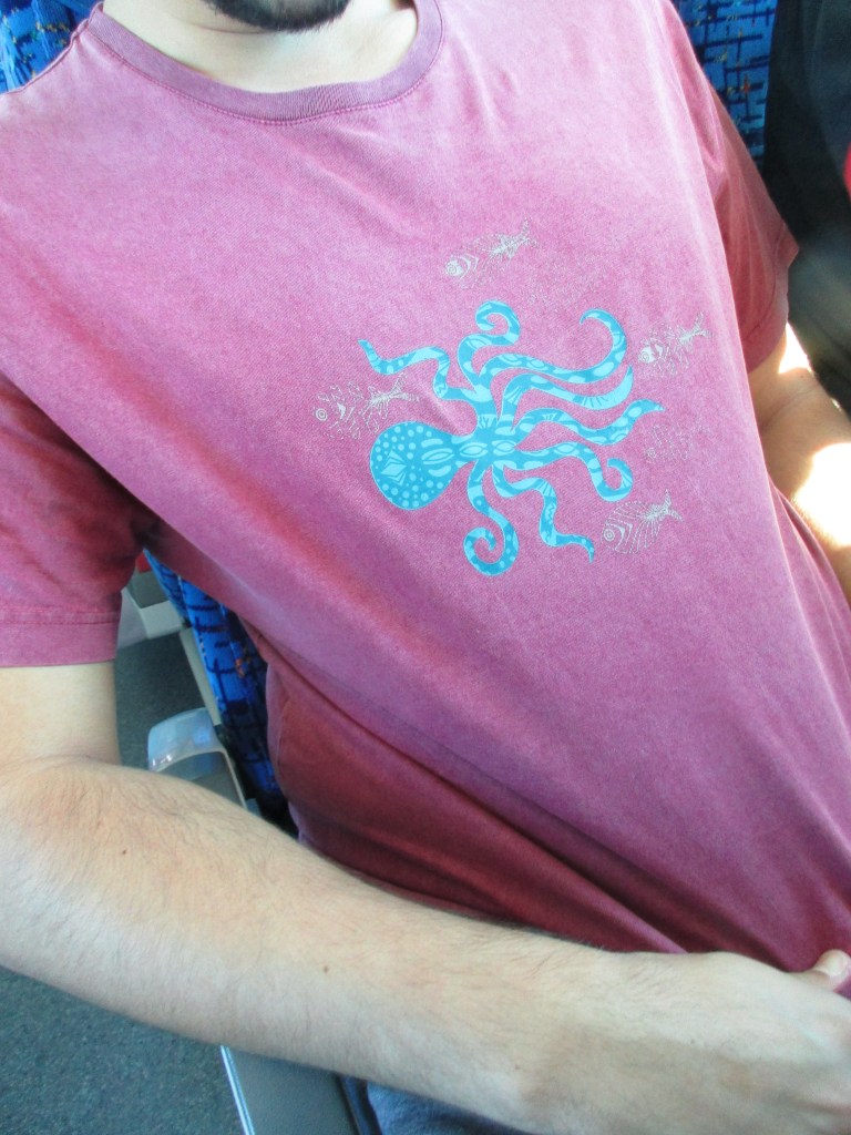 They even followed me (or found me) on my recent trip overseas. On Day 6 I took a cross-country bus. Along the way, we crossed over the Corinth canal – sadly too far away to see any sea life. On another bus trip, however, this young man with his octopus t-shirt was seated right behind me. How serendipitous.