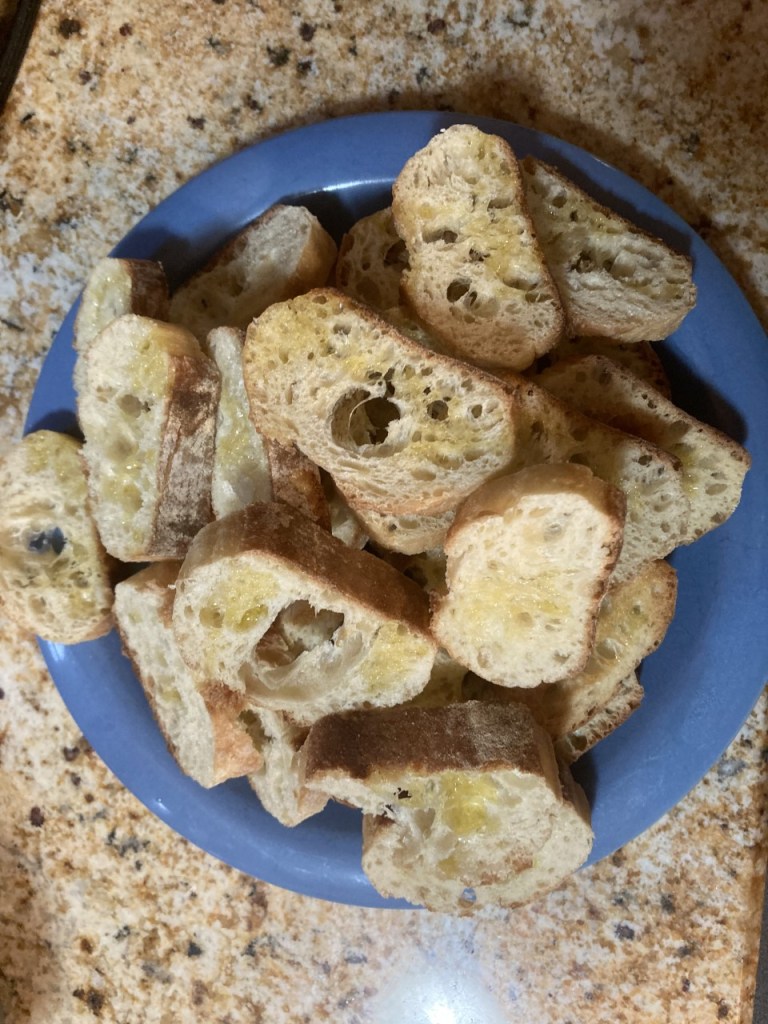 Today was kind of “chore cooking,” my approach was to get it done. I sliced and toasted two day-old loafs (one baguette, one ciabatta) for homemade bruschetta.
