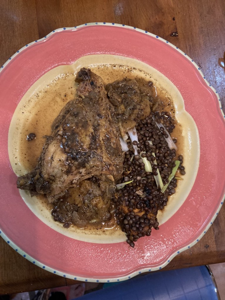 Chicken Curry and Glazed Sweet Potatoes with Lentils. Two dishes stand out from the rest I served in the past few weeks. When I got home, Daughter was off on her own trip. A two pound bag of sliced peaches was taking up space in the freezer. I chose a savory use for them, chicken curry, instead of a dessert. The timing was right with Daughter being away; I resist using a number of spices because her palate does not tolerate them. Curry chicken it was.