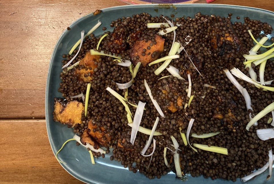 Assembly. Heat 2 Tbsp olive oil in a skillet. Add pieces of sliced sweet potatoes. Brown on both sides. Remove from heat and add the glaze. Return to heat, cook about 1 minute. Arrange the sweet potatoes on a platter, top with scallions. Add the lentils and toss together.