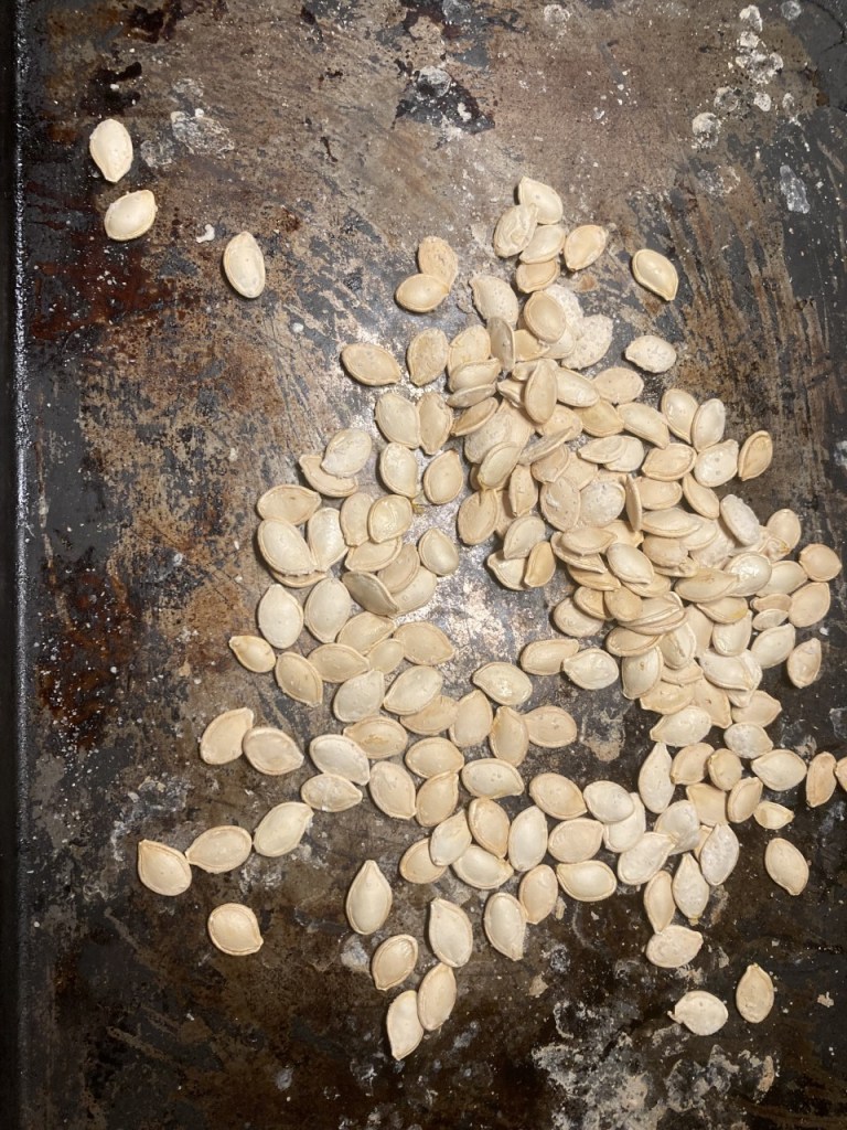 Pumpkin Seeds. Long ago, my mother and I enjoyed making and crunching homemade pumpkin seeds harvested from the gourds carved for Halloween. It’s been a long time since Daughter and I followed in Mom’s footsteps. I know we’ll make short work of the freshly made seeds from today’s pumpkins.