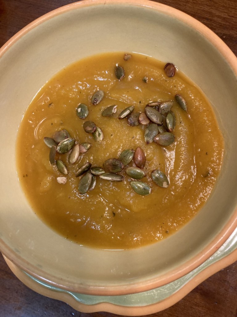 Pumpkin Soup was relatively easy to make. Clean, cut, take the seeds out of the pie pumpkins. Roast with one or two cut onions and a head of garlic in a 375 degree oven for 50 minutes. When cool, remove the skin. Put the pumpkin chunks and vegetables into a saucepan with four cups of broth or water and several sprigs of fresh thyme, salt and pepper to taste. Bring to a boil and simmer for an hour. With your immersion blender blend it all together until smooth. When serving, top with pepitas (Mexican pumpkin seeds).
