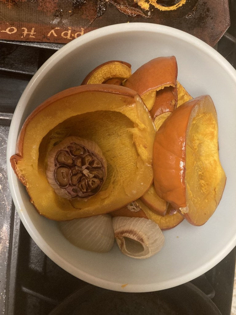 Next up was to clean and roast three pie pumpkins abandoned on the counter to use for a pot of pumpkin soup.