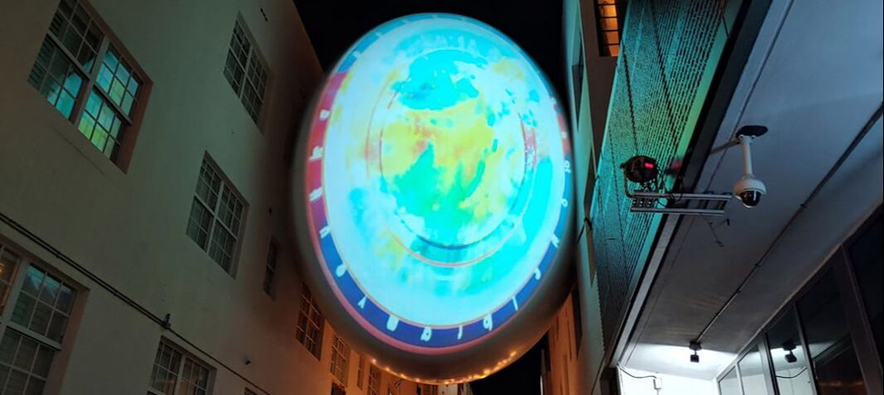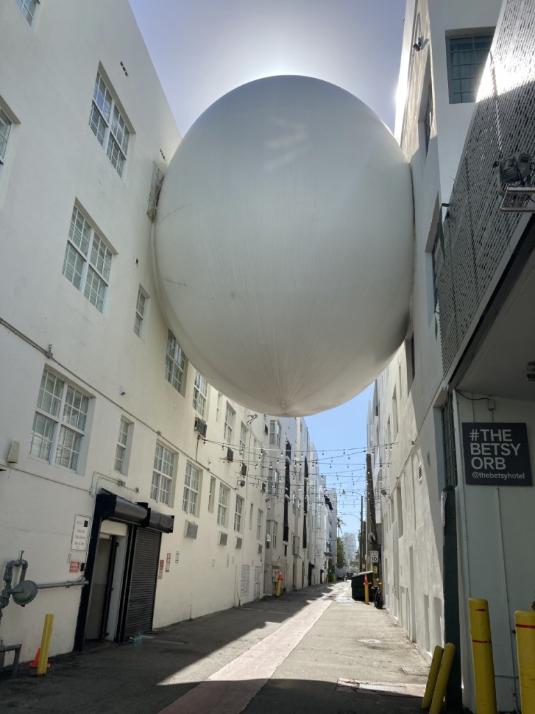 Our next stop allowed us to take in a number of artworks and gave us that much-needed post-Thanksgiving walk. The Betsy Hotel, a great supporter of the arts, hosted the work of Sri Prabha, “Cosmic Occupancy,” video projections on and around The Orb. We did not actually see the work in daylight. Hopefully we’ll see it when we return to the Betsy on evening. Here’s the Orb and an image taken from the artist’s website.