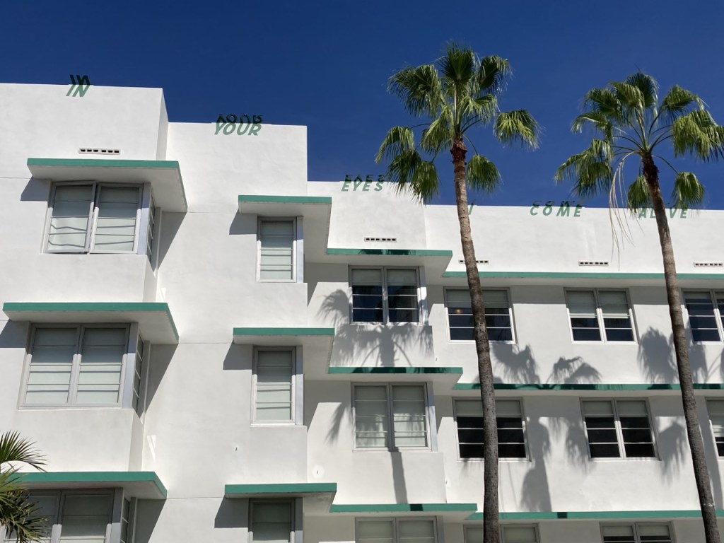 Our starting point was South Beach and the Avalon Hotel. Here, Jessy Nite’s “In Your Eyes, I come Alive” perches on the façade the hotel creating shadows of the phrase along the top of the building. Look at the shadows.