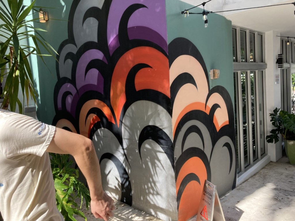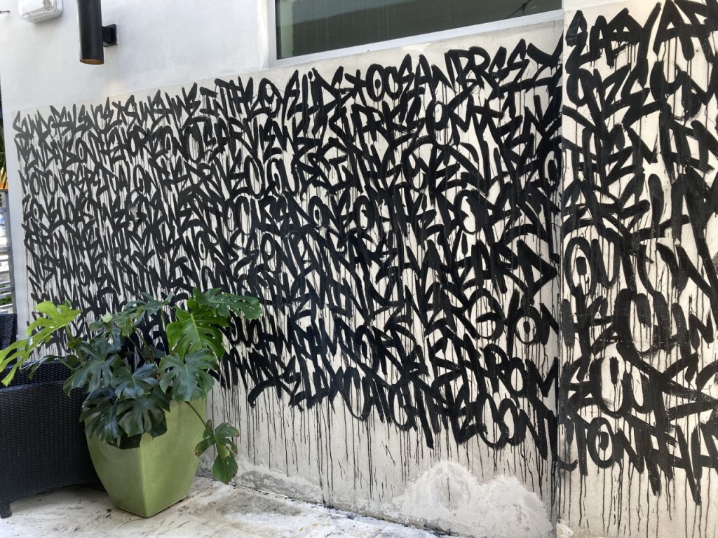 Walking back to the car we stopped for No Vacancy at the Esmé Hotel. This hotel and the neighboring properties, formerly known as the Clay Hotel, were recently beautifully and thoughtfully restored and renovated. Legend has it that this was one of the locations frequented by Al Capone during his Miami residency. Shown in an alcove of the refurbished hotel lobby is Beatriz Chachamovits’ “Carcass,” a hand-built ceramic installation highlighting ocean degradation, coral bleaching, coral harvesting and plastic pollution. The celestial background is not part of the artwork.