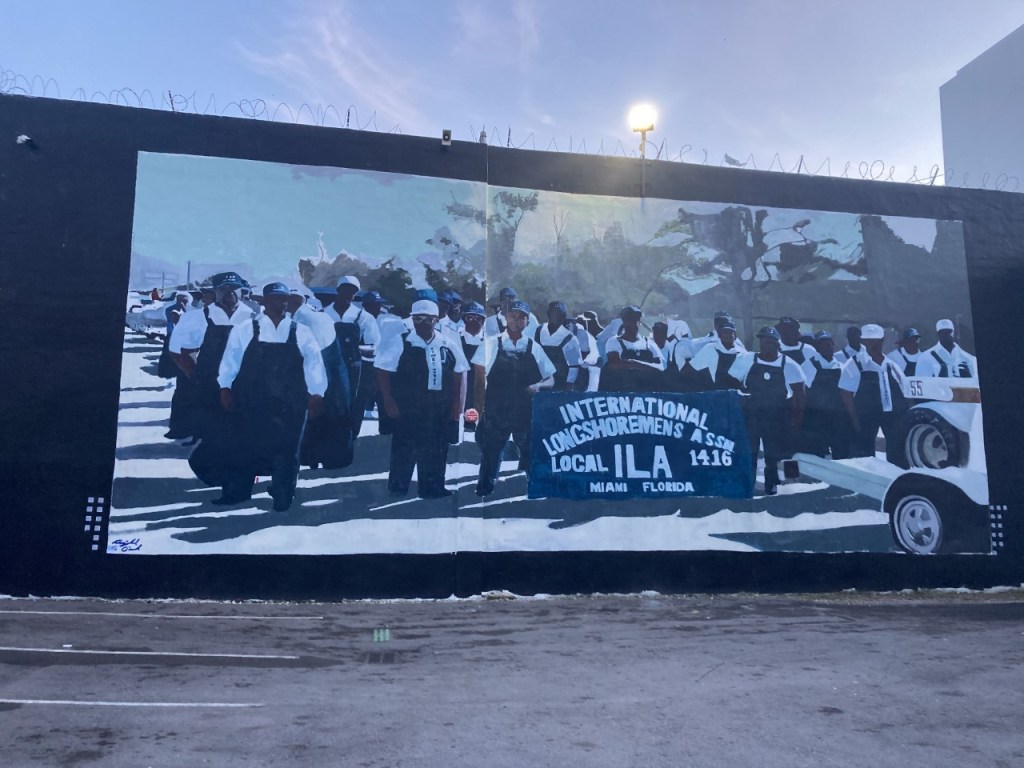 The second act of our Prelude included visits to various and sundry galleries during their monthly Progressive Sunday Brunch timed to catch visitors in town for the Big Show. The most remarkable and resounding work CC and I saw during this part of the Prelude was the stop at the Ward Rooming House, a restored rooming house, now gallery, in historic Overtown (https://www.hamptonartlovers.com/gallery). We joined a presentation of a new mural by Reginald O’Neal recognizing the role of the Longshoremen in the community. This impressive work was sponsored by MOCAAD, the Miami Museum of Contemporary Art of the African Diaspora, a new museum effort in our community.