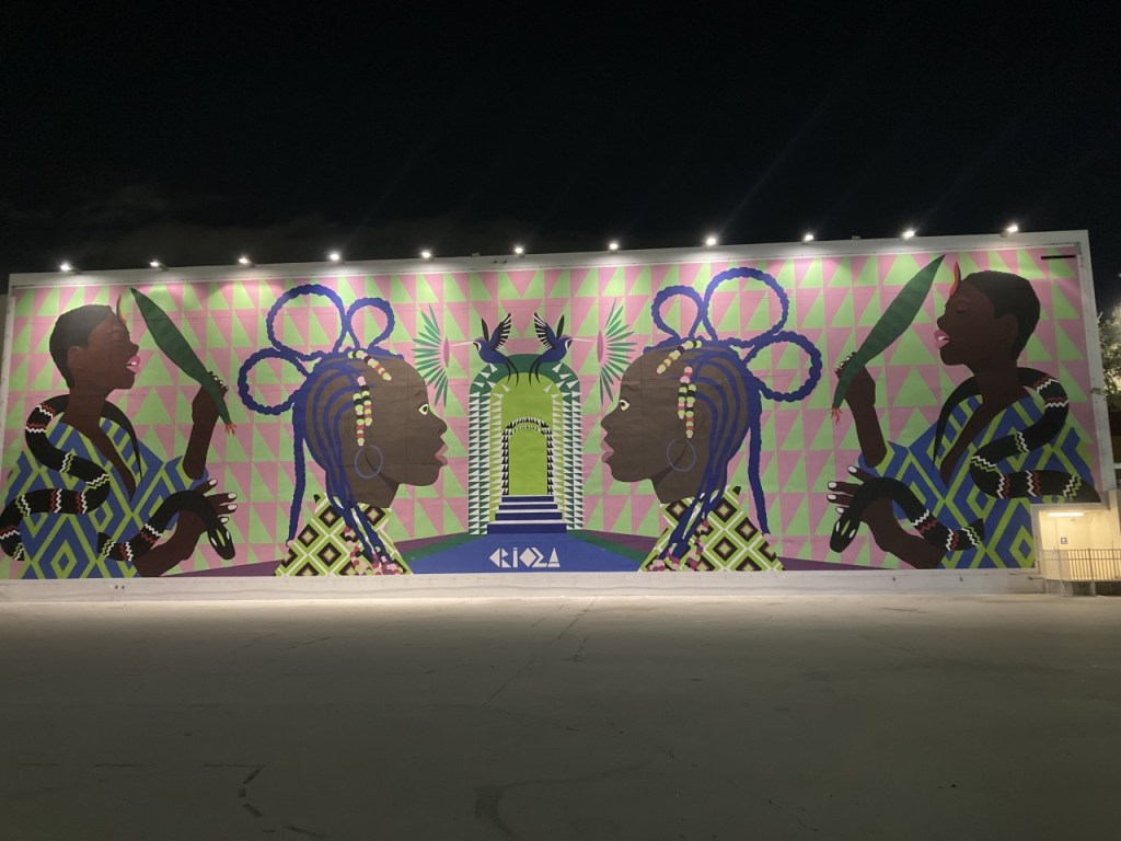 Brazilian artist Criola, in her largest mural to date, created a Gemini image, titled “Interdimensional Portal,” that explores associations to identity and culture through figuration, symbols and motif, and invites a rethinking of what defines Black female identity. It’s a modified Rorschach test; female protagonists are adorned with layered symbols. Hummingbirds, common to Brazil, hover over flowers seeking nectar. Two women are wrapped in snakes and hold elongated plant leaves. Snakes can represent danger while also offering healing venom. The flora and fauna adorning these women signify medicinal virtue.