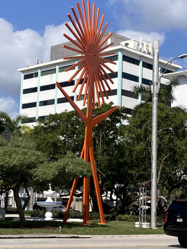 “Trapeze Contortionists,” is the work of Haitian-born artist, Edouard Duval-Carrié. The work incorporates the silhouettes of fifteen figures of dancers high above the historic Española Way corridor (see 12-22-2021 post).