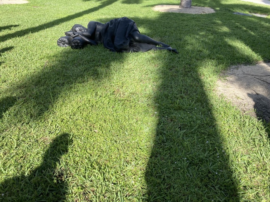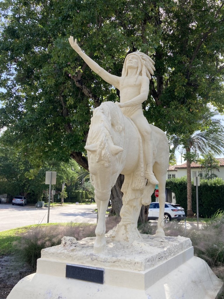 “The Great Spirit,” by Italian sculptor Ettore Pellegatta in 1924, stands just a few feet from and overshadowed by Starchild. It was originally installed at the Nautilus Hotel in Miami Beach and moved to its current location in 1959. “My husband had the statue erected there,” Mrs. Carl Fisher* said, “because he was opening up that section of the Beach for development and he needed something to designate the new area.”