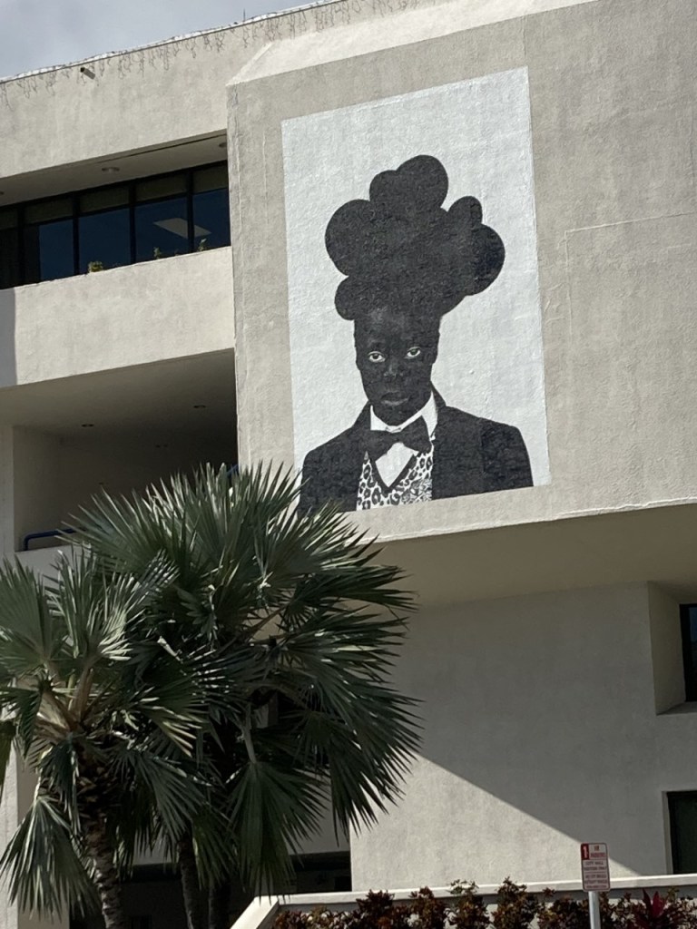 Next stop was our city hall and the oversized portrait by Zanele Muhole. “Phaphama at Cassilhausi,” “awake” in Zulu, is a persona created by Muholi during a residency in North Carolina, wears a leopard print vest, a velvet jacket, and a bow tie.