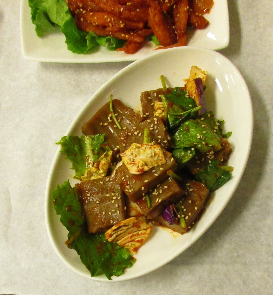 Dotori-muk (도토리묵) or acorn jelly is a Korean food made from acorn starch. I think it’s a winter selection in the banchan offerings.