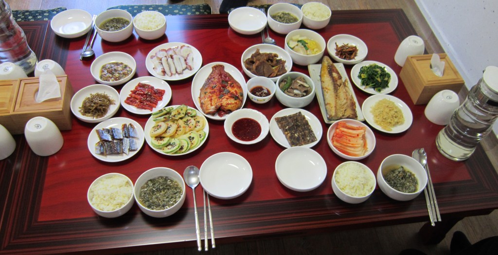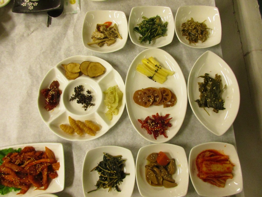 Accompanying meals is an array of what we could call appetizers or banchan. Banchan can be vegetables, some pickled or prepared otherwise, fish, and more. If you like one and finish it, your dish will be refilled