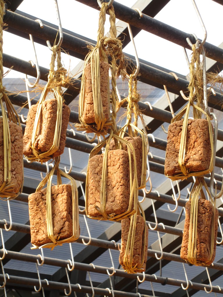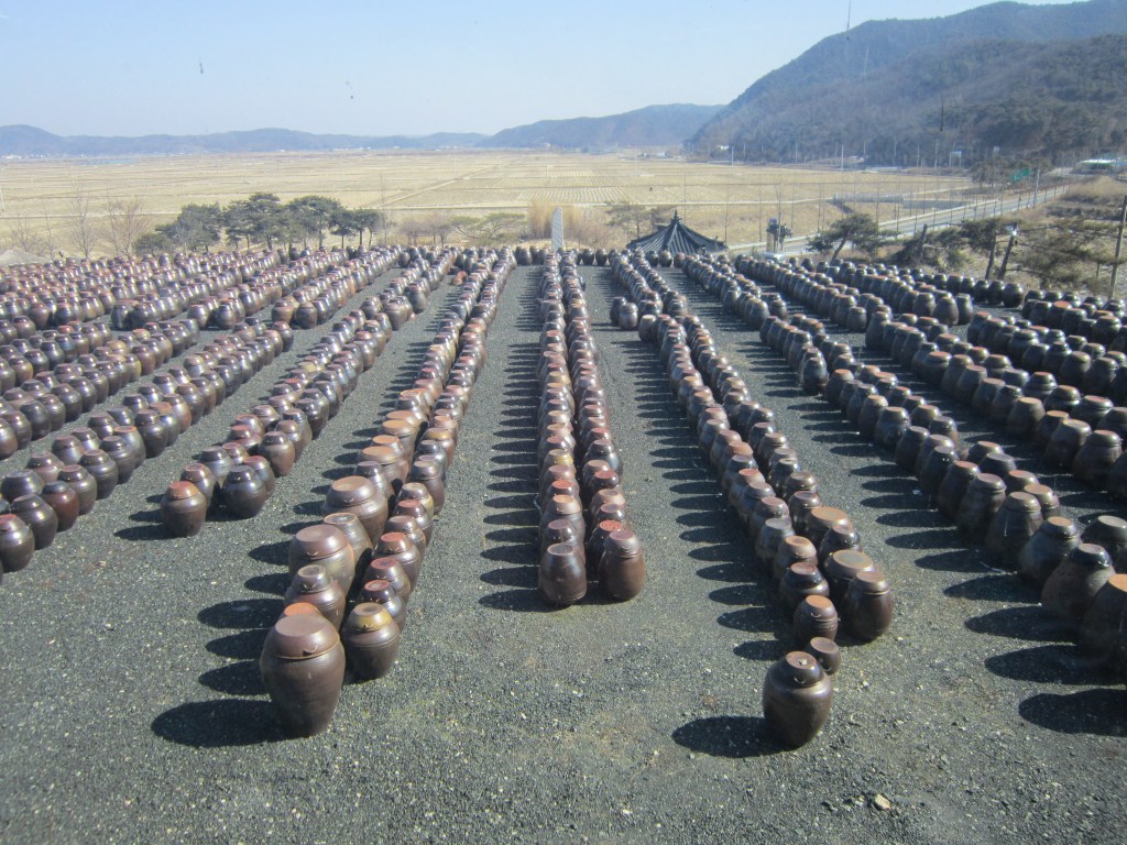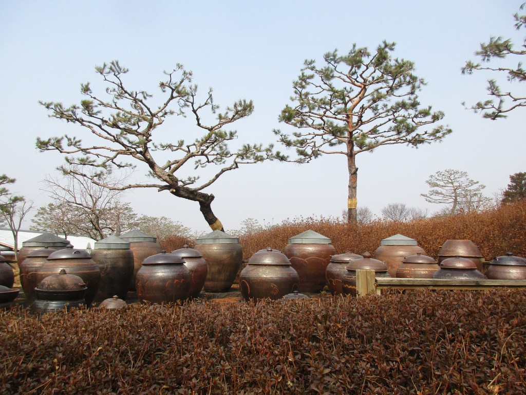 Korea is a country of kimchee, a method of preserving the wealth of vegetables during the hard winter. Homes will be surrounded with pottery jars like these, holding their own versions of kimchee.
