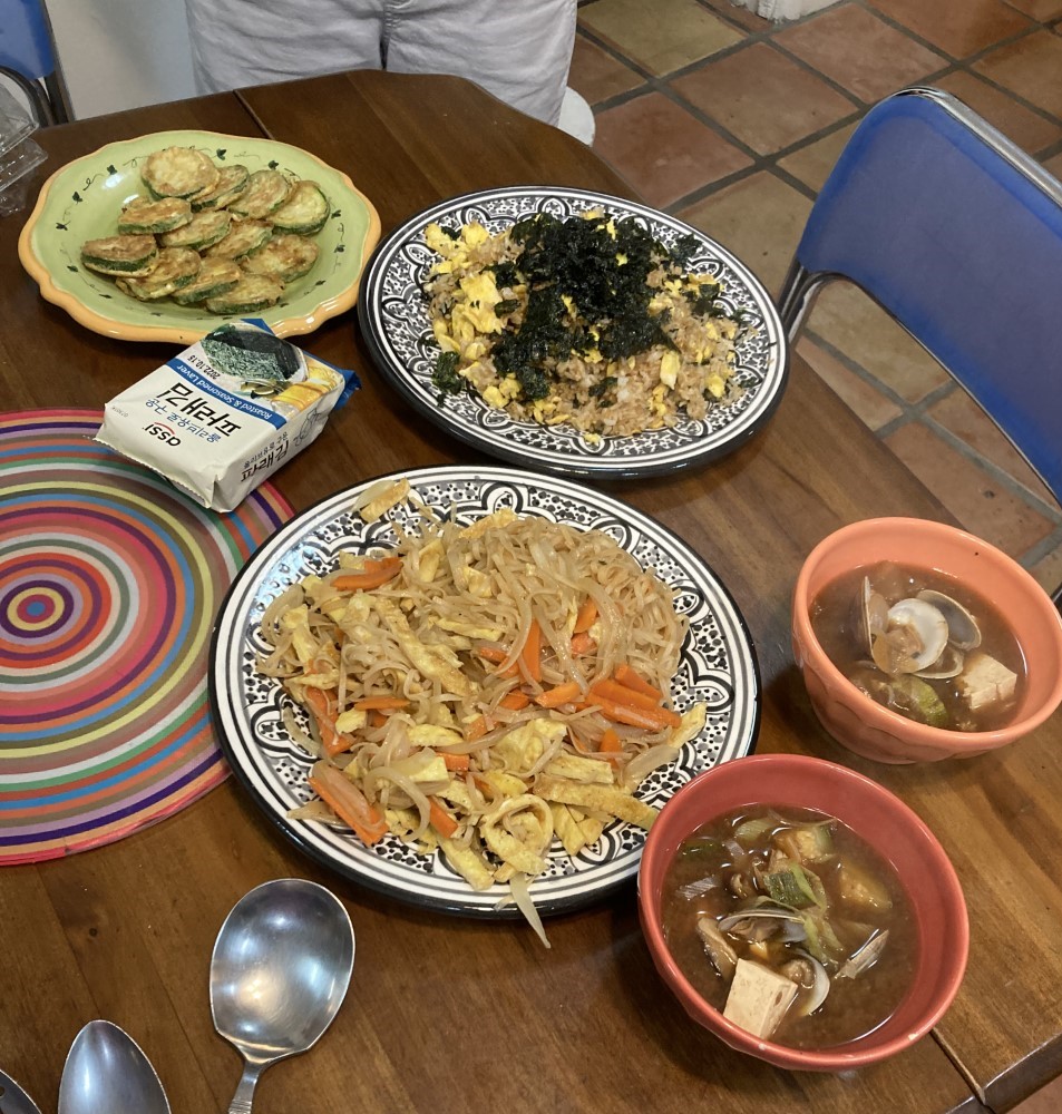 Last week, she came over to cook us a Korean dinner while preparing to return home. Her menu was constrained because of daughter’s lack of tolerance for even the smallest hint of piquant spice. What a meal we had. First a miso-based soup with clams and vegetables. Next, using my pantry, a nice noodle and vegetable dish, a zucchini dish, and fried rice with lots of egg.