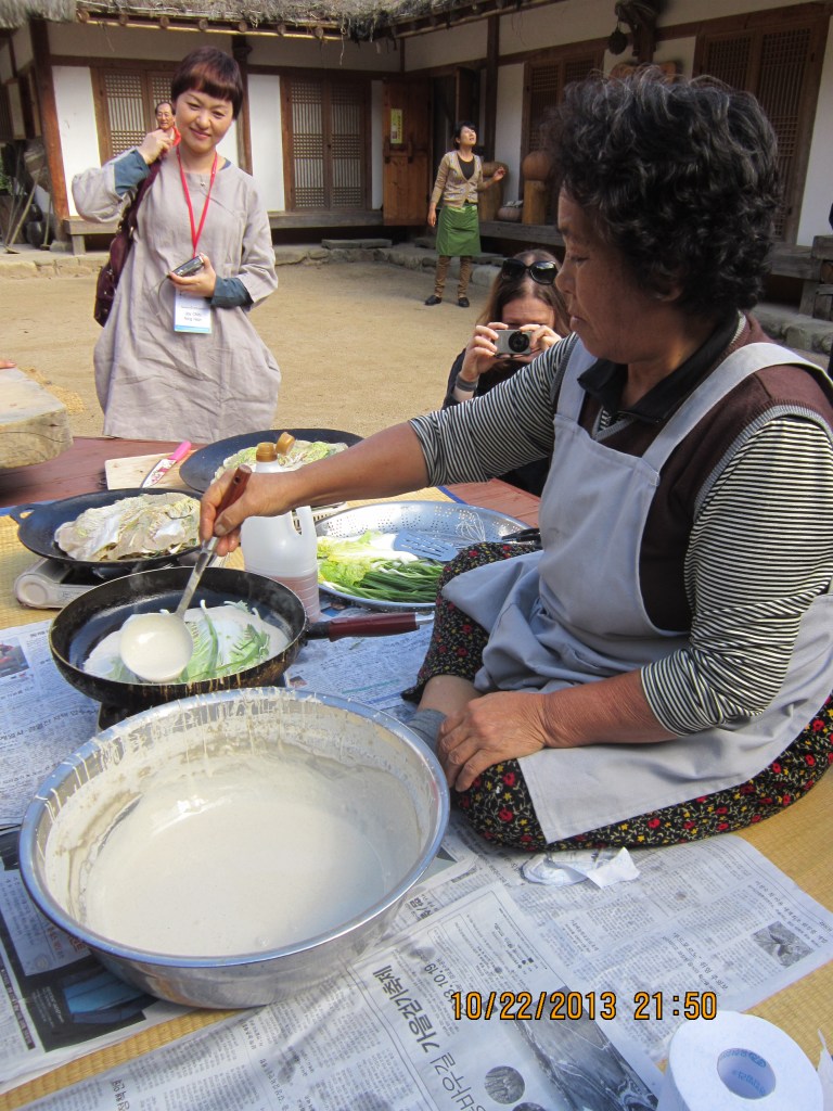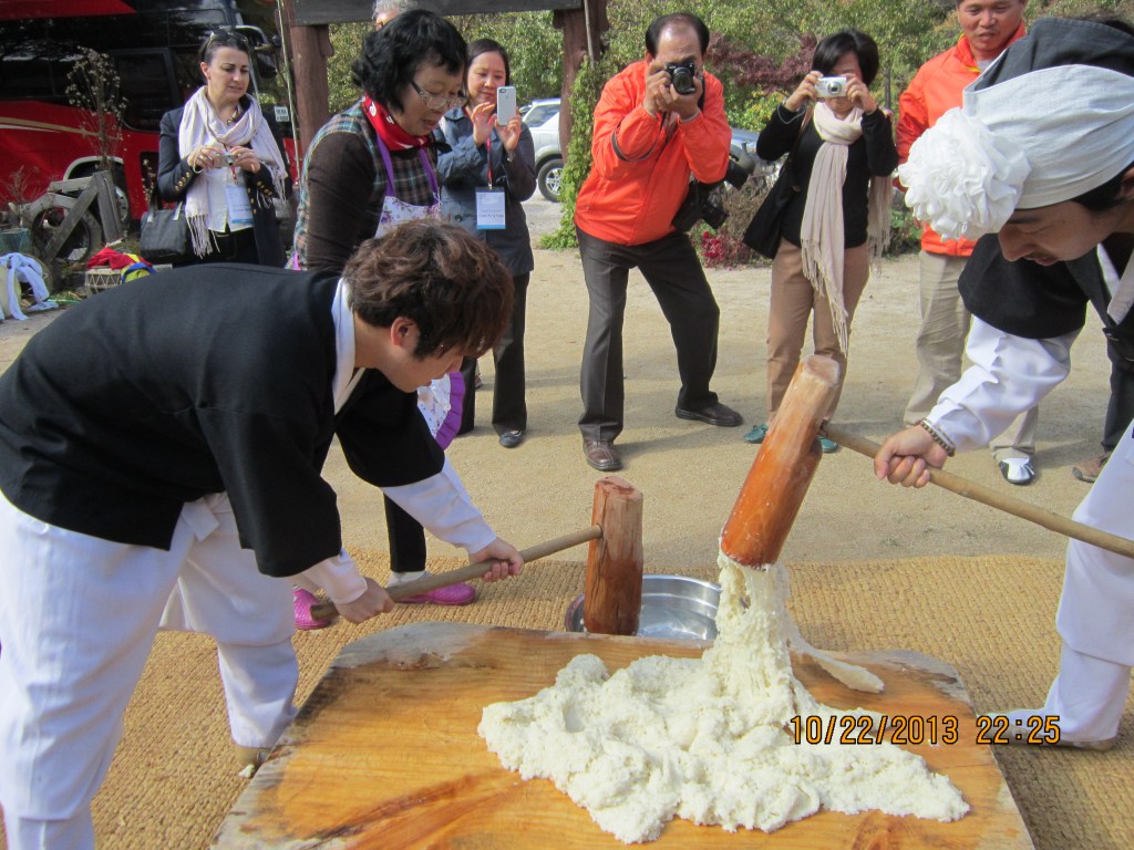 Two very typical dishes are rice cakes, tteokbokki, either cooked in a spicy pepper sauce or prepared sweet, and different varieties of jeon or pancakes (a dish I try to replicate from time to time to the pleasure of the family). I think you can fine both in the freezer section at Trader Joes! Excursion stops during the conferences I attended often included venues to pound the rice for rice cakes with huge wooden mallets, some sort of embarrassing activity. Those on the sidelines enjoyed tasting jeon.