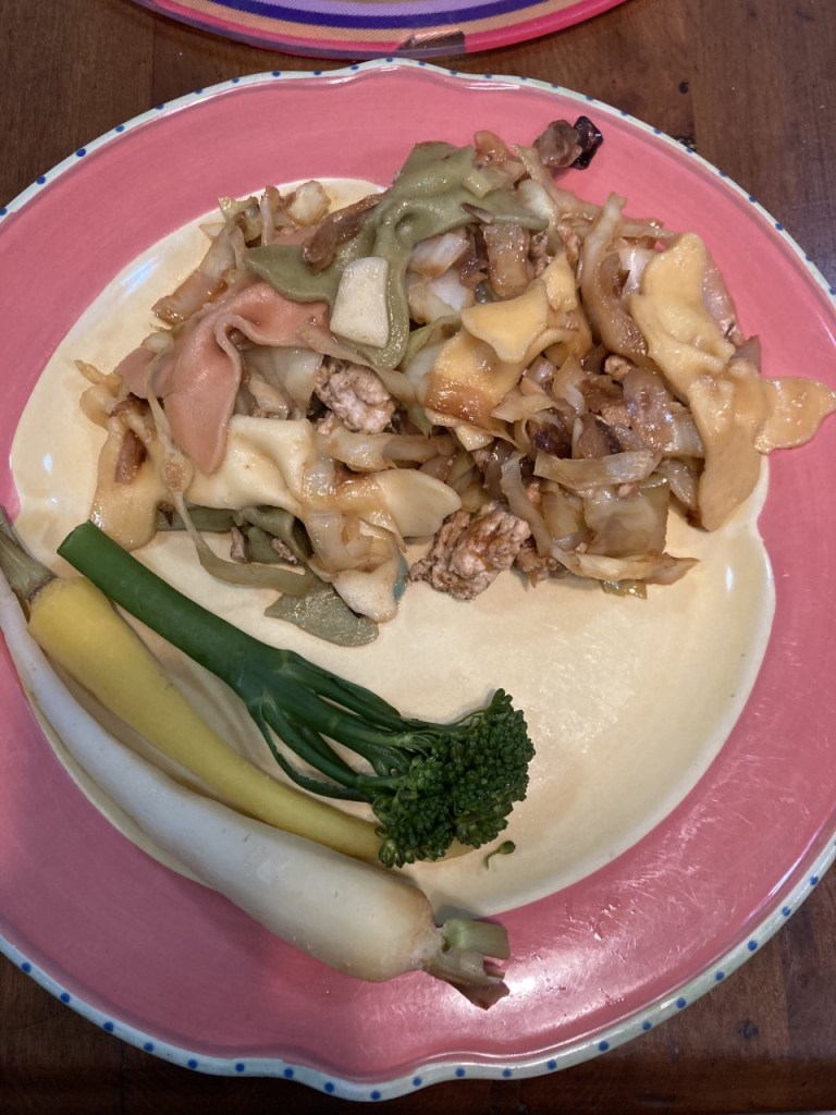 In the meantime, cook a package of pasta of your choice as directed on the package. Could be egg noodles. I used a really cute and tasty Papillon pasta waiting to be used in the pantry. Last step, when the noodles are ready, take 2-3 large spoonfuls of pasta water and add to simmering meat mixture. This trick adds nicely to the sauce.