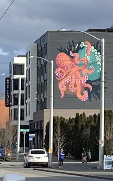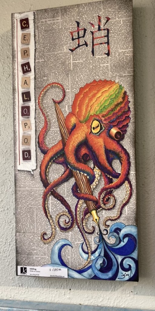 All along the way, during our trip, I found an old friend who continues to pursue me – the intelligent octopus (see 5-4-22 and 11-1-22 posts to be introduced)! Several species of octopi inhabit the waters in the area of Seattle. Maybe next trip I’ll try to find one in the flesh. Here’s some of the places where they in their appearances …