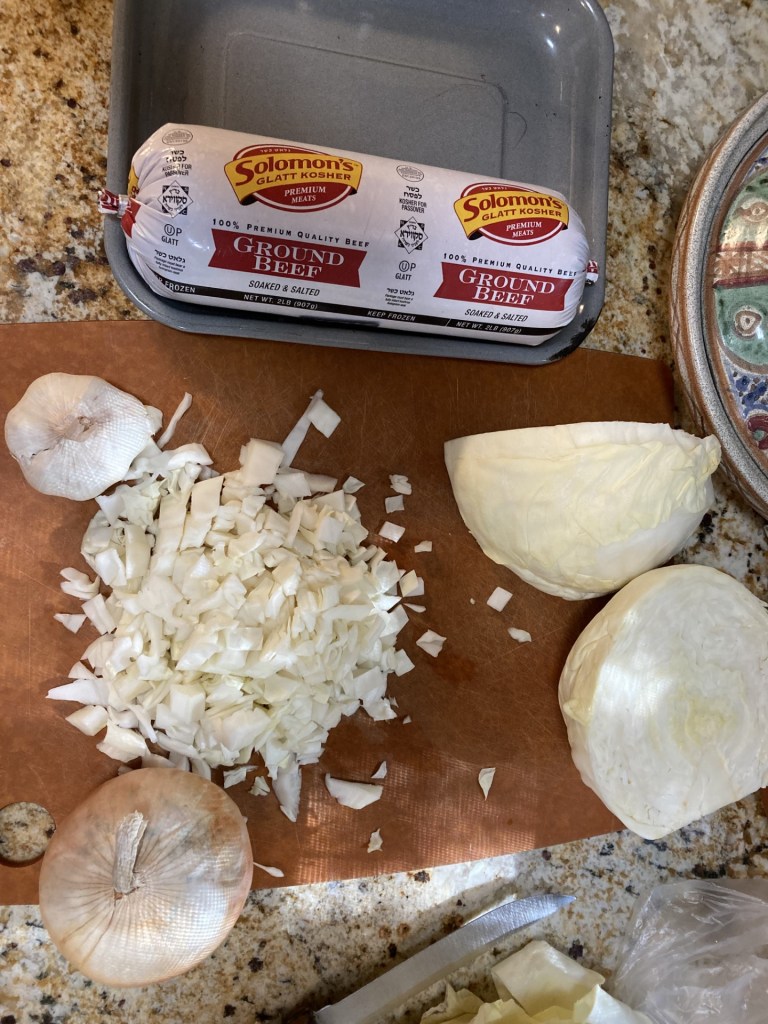 In addition, as Sukkot is an autumn festival, fall foods are featured. Stuffed cabbage, a totally Eastern European food – whether prepared by Jewish or Christian cooks – was not favored in my mother’s Greek Jewish kitchen. Mom was much more likely to prepare stuffed grape leaves (always meat and rice) or stuffed vegetables (especially tomatoes and green peppers). A recipe for a deconstructed stuffed cabbage caught my eye when it crossed my desktop recently. I had both cabbage and frozen ground beef. A Sukkot meal followed some pretty intense cooking, including learning at least one new skill.