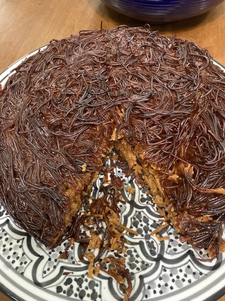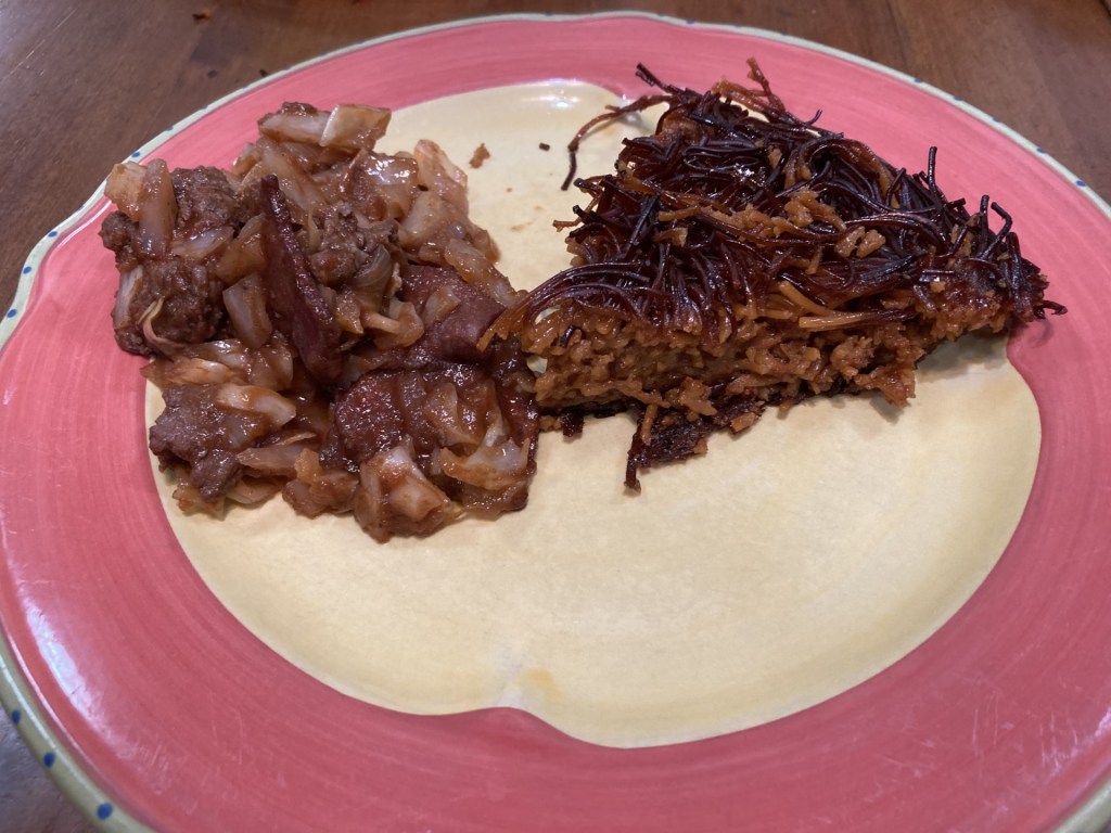 Yerushalmi Kugel.* I forget on which tv travel show I saw this intriguing dish first. It always appears to be about 6” high whne finished. I guess this result was based on the diameter of the cooking pot used. Mine, prepared in my smallest dutch oven, barely reached 2”. I cannot say if this would affect the kugel’s taste.