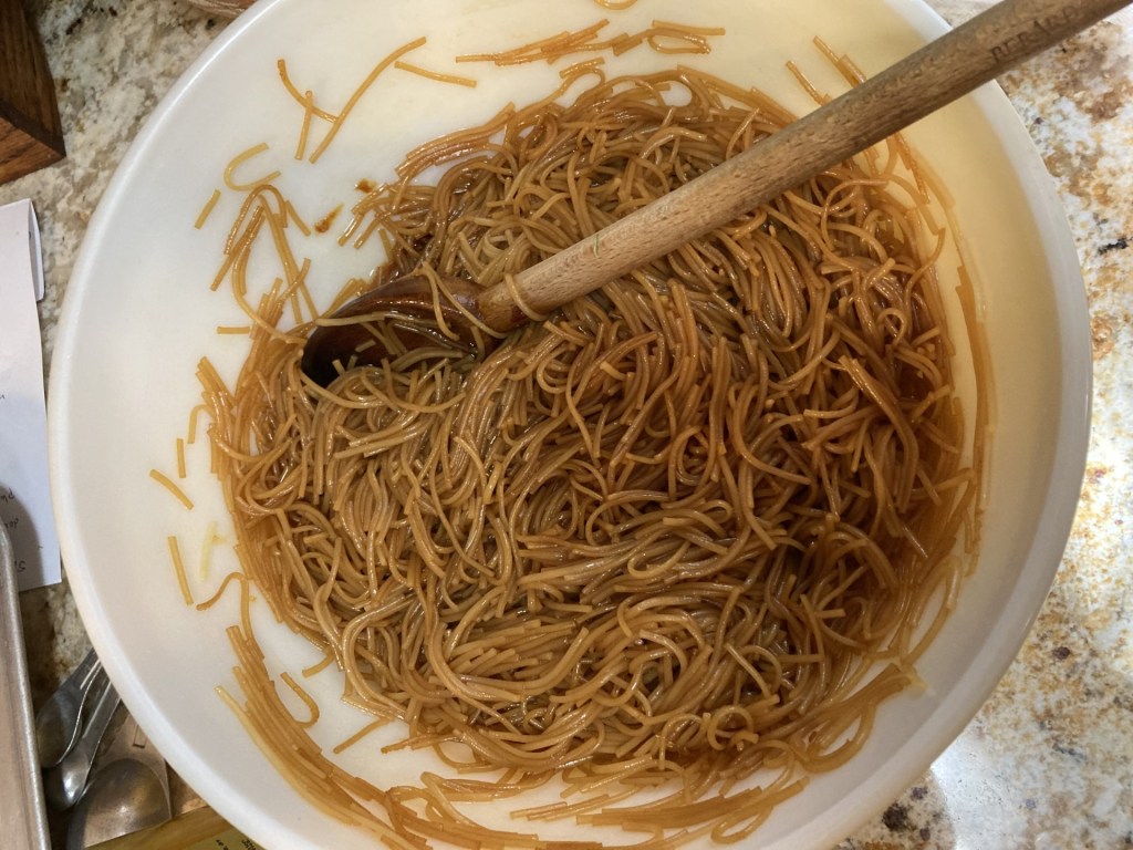 I didn’t think I’d cook for the wonderful fall festival Sukkot this year (see 10-12-2019 post for more about Sukkot). But there I was at the end of the week considering some recipes I’d collected along with what I had in the fridge and freezer. During Covid one of the Jewish dishes that were shown numerous times was Jerusalem kugel. Numerous tv tour shows tromped through the narrow alleyways of Jerusalem’s old city in search of this specialized kugel. A number of chefs disseminated recipes for it online. I’d bought the appropriate noodles specifically for it when I was in the market recently. I told myself the time was right.