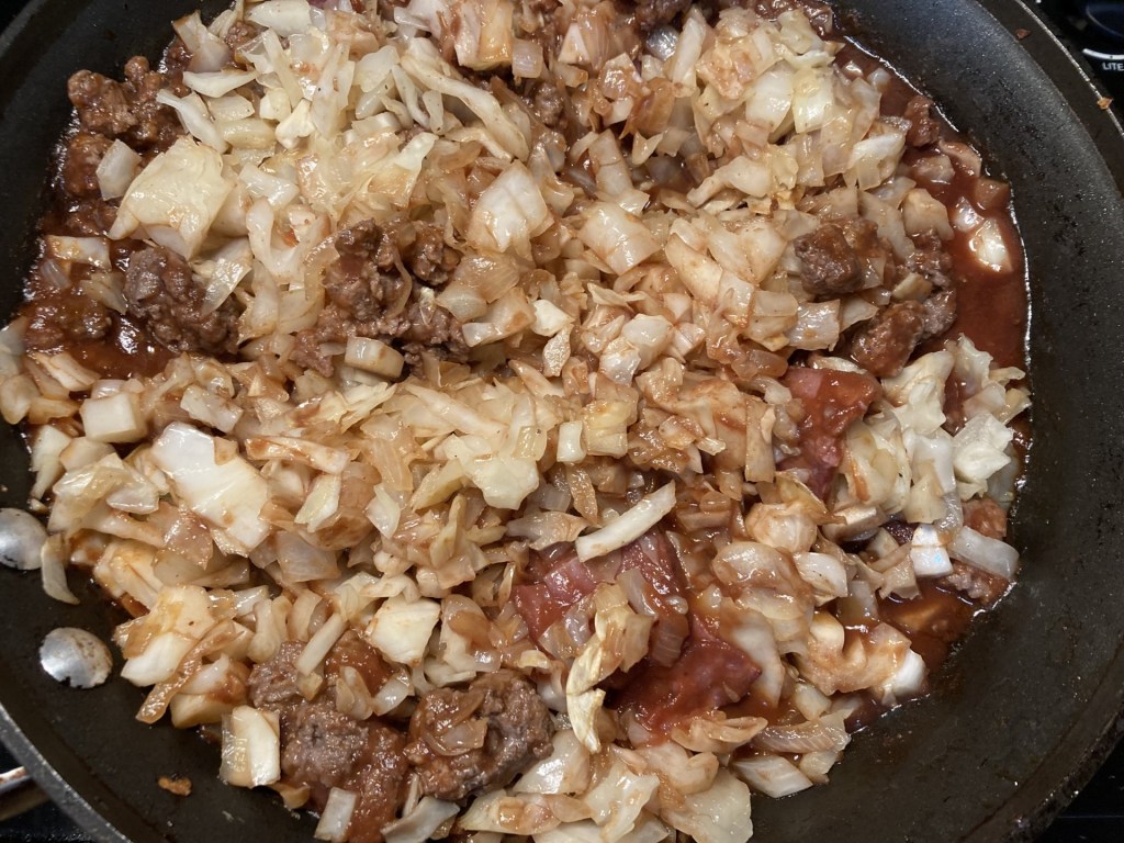 Unconstructed Stuffed Cabbage.* In a large skillet fry 8 oz of beef bacon+ cut in 1” pieces over a medium heat until crisp and browned. Remove and set aside.