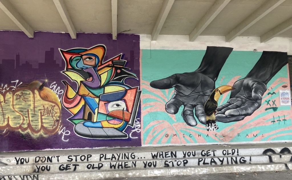 Before I picked up CC and the other member of our newly formed “art club,” I took the time to ramble around the Design District, to see the new installations and other art experiences. First stop was The Chronicles of Miami, the epic photographic mural by French artist, JR (https://www.jr-art.net/projects/jr-murals.app). A year ago, he visited ten neighborhoods around town and photographed 1,043 people. Their portraits were collaged together to created. The sound portion of the artwork thus creates an immersive portion of the artwork, as well. I tried to look, but did not recognize anyone! A second interation is installed on the walls of Superblue (https://www.superblue.com/miami/).