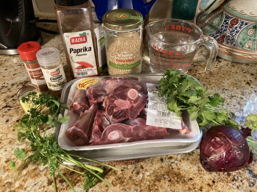 Lamb Tagine. Start with about 2 pounds of lamb shank (or goat). Marinate for 2 hours in a glass bowl with 1/2 tsp each of powdered ginger and cumin, 1 tsp cinnamon, 6 springs, each of chopped Italian (flat) parsley and cilantro.*