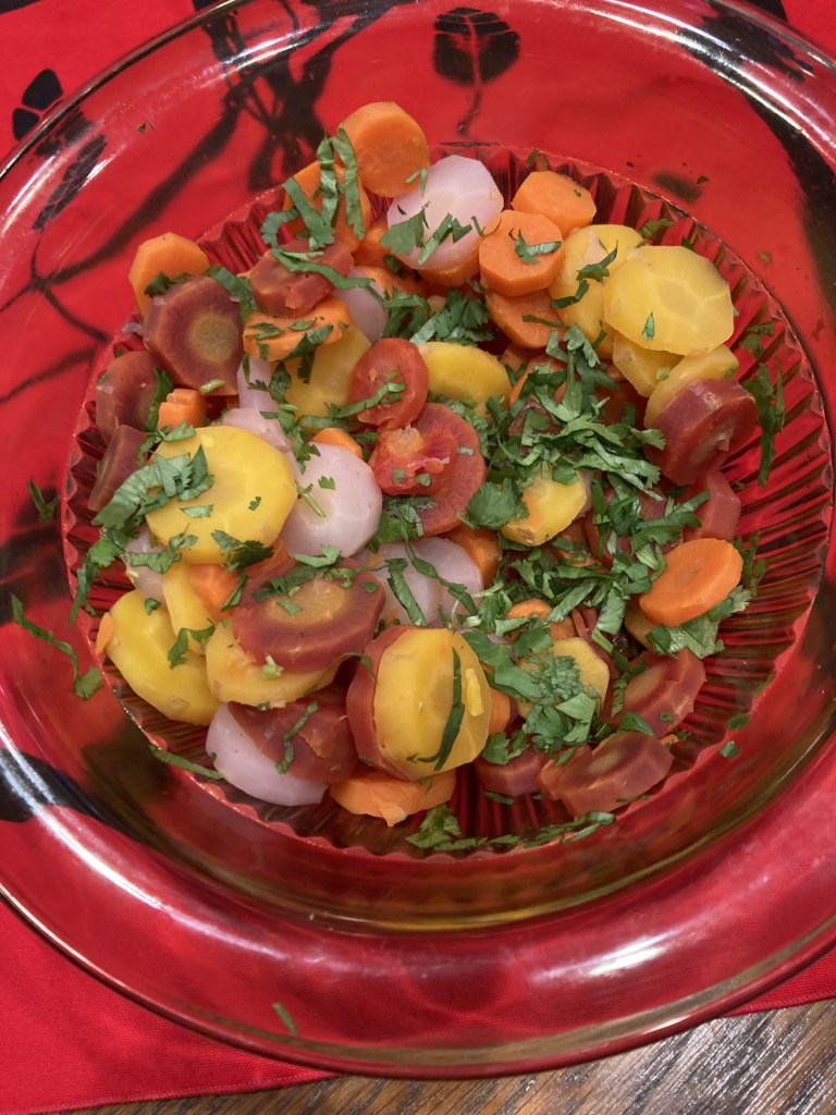 Side dishes I made were Moroccan marinated carrots, a chickpea salad, and non-Moroccan fennel and celery salad. Also couscous. Our guests had never seen the rainbow carrots and were enchanted.