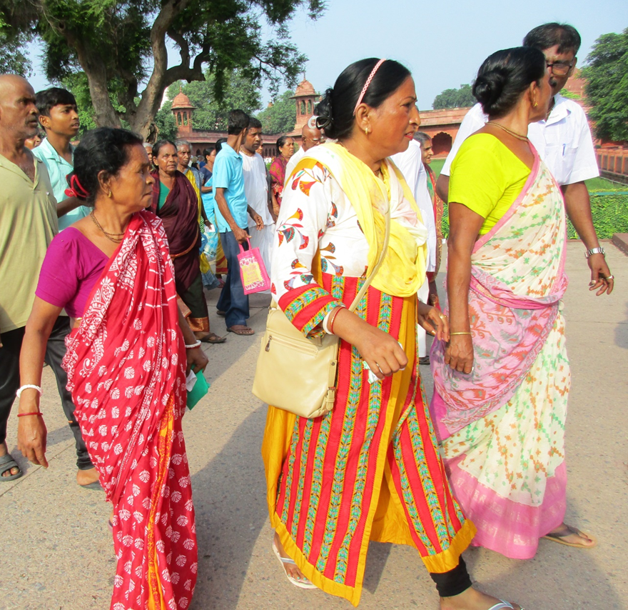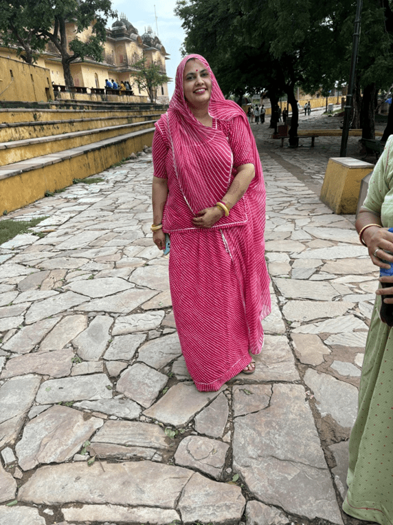 Everywhere you look in Jaipur and elsewhere in India, bright colors, different patterns, glitters of gold and other bling, as we say now, catches your eye. Ladies in everyday dress on the street, in the shops, in tuktuks (also known as “autos”), on motorbikes paint the otherwise dusty city scape. I could not get my fill of this bright and lively landscape.
