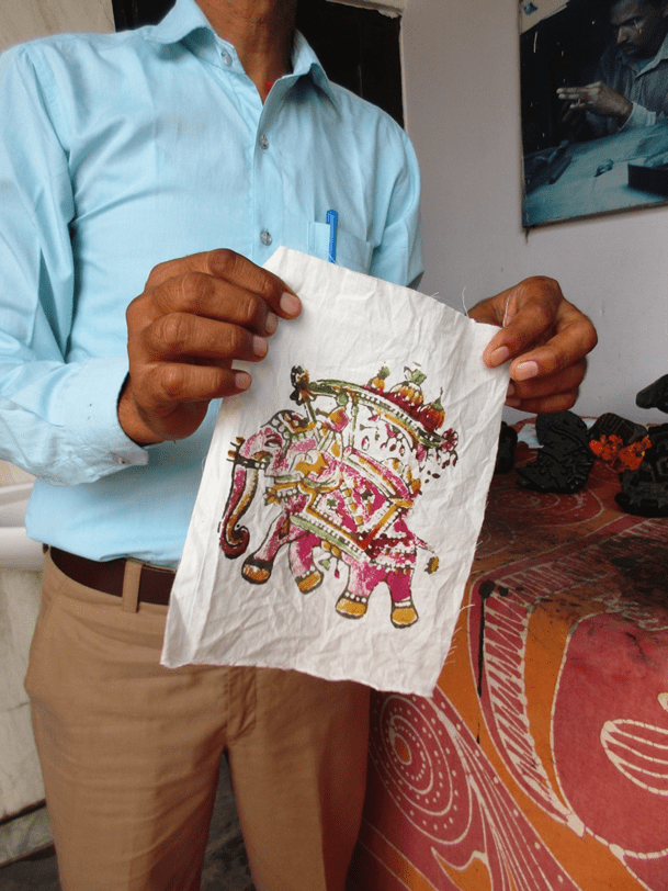Before the ritual chai and hard sell, you get to try your hand at the printing process. It’s always the elephant.