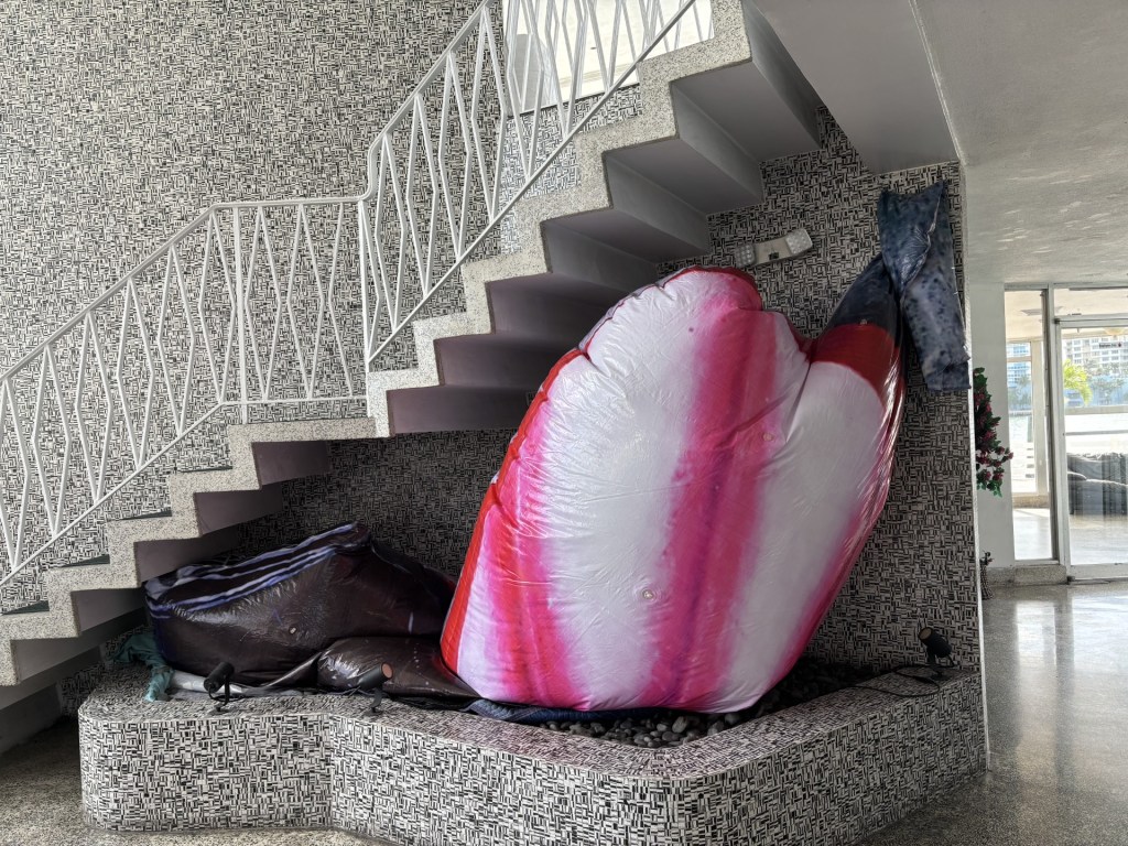 Haitian American artist Asser Saint-Val’s “Aquatic Incursion-MHEDRAYNGT” is a series of sculptural installations integrated into the hotel’s architecture. His sea life-inspired structures create a surreal, otherworldly aesthetic that contrasts with the iconic art deco buildings of the city as they invade the built environment.