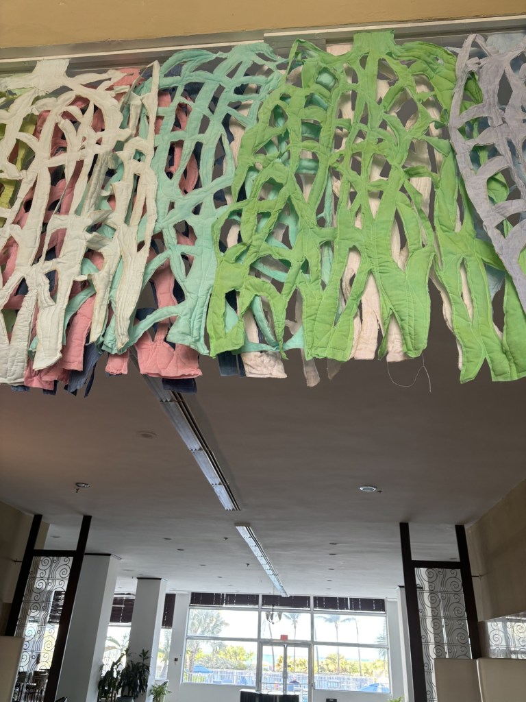 Patricia Cooke’s “Anondyne” is a suspended series of quilted figures that recreate a view of the intricate mangrove root systems. It is another artistic observation of climate change with we who live here face.