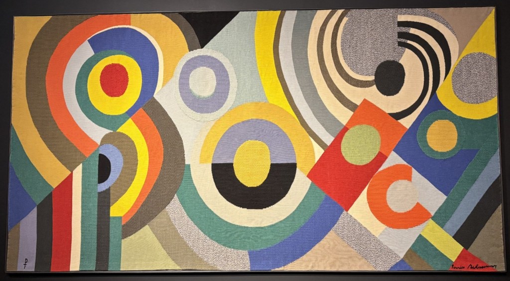 On the other hand, alongside Calder’s works, I noticed this carpet. I recently read about an early 20th century abstract art movement called Orphism in Artsy. Here it is in living fiber colors!
