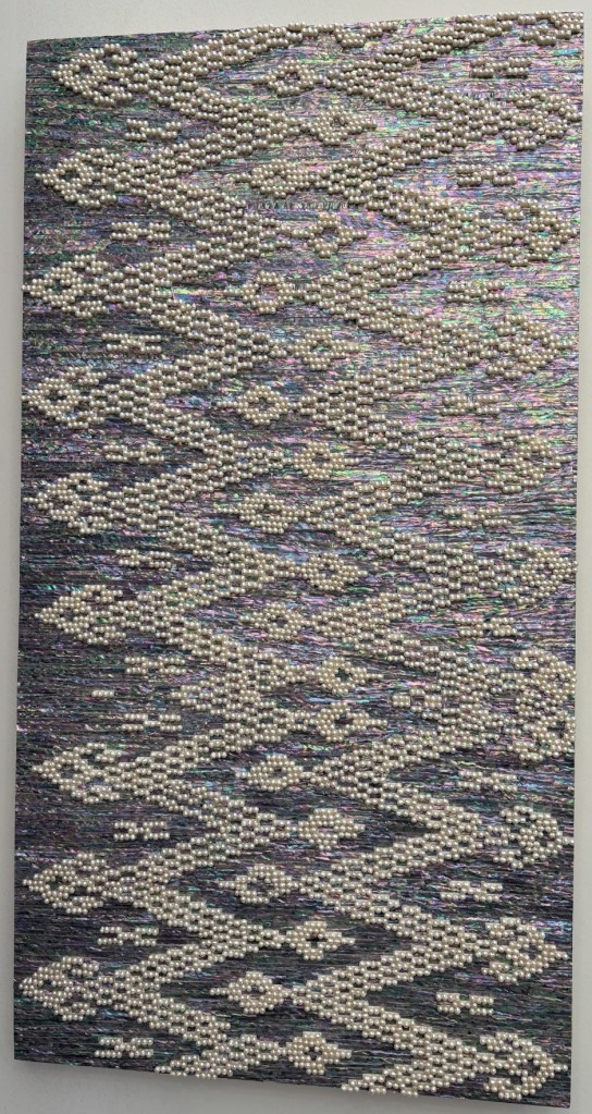 Charlene Tan, a Filipina-Chinese-American identity, draws from her her artistic cultural heritage of tribal weaving patterns of the Philippines. Her work focuses on the immigrant diaspora and identity. She uses trade Filipino goods such as pearls, mother of pearl, mung beans to meticulously construct her tapestries that reference traditional tribal weavings and tattoos.