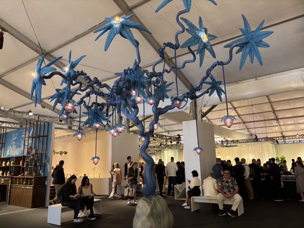The floor of Design Miami was hopping. Lots of people enjoying lots of new, imaginative approaches to furniture, décor, jewelry, and other aspects of design. Lots of VIPs enjoying the Perrier-Jouët. I look forward to imaginatively engaging installations by Perrier-Jouët; this year there was none. On the other hand, the center of the fair was overshadowed by the Haas Brothers’ large-scale Strawberry Tree co-presented by R&R Company and Marianne Boesky. The structure is made up of leaves made of networks of thousands of vintage blue beads and over-sized pink luminescent glass strawberries.