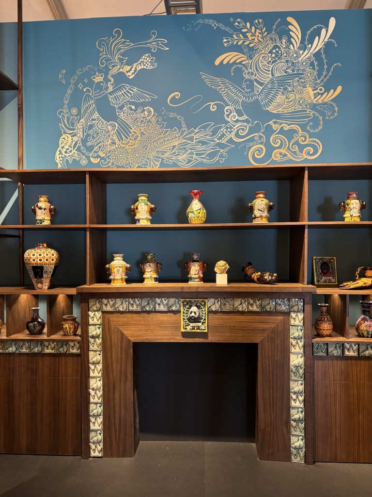 A display of the work of the Philadelphia-based ceramic artist, activist, educator, and spoken word poet Roberto Lugo was opposite the tree. Lugo, raised in New York City, honor his Puerto Rican heritage and culture and the people with whom he grew up. The bodega-inspired storefrong from R & R Company is called the Village Potter. They hope to show that art and design are for everyone.