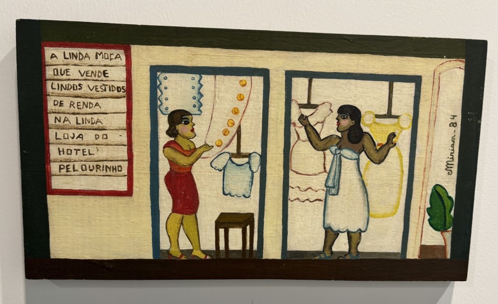 Brazilian artist Miriam Inez da Silva grew up in an area in which there were reports of miracles. She studied art in Rio de Janeiro where she specialized in woodcuts and painting. Da Silva captures in her unique style images of community and family. A collection of her paintings were represented in an Art Basel Kabinett.