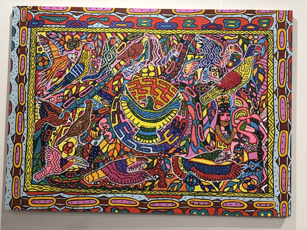 I rarely stop at the Positions section of the Basel fair. This year, it was impossible to pass up. First was the exhibition of dense, richly colored images created by artists presented by the Huni Kuin Artists Movement (MAHKU). Their image-filled paintings are the result of several university drawing workshops held in the upper Rio Jordão region, Brazil, near the Peru border. They represent traditional narratives including the story of kapewë pukeni (the alligator bridge). The myth describes the passage between the Asian and American continents.