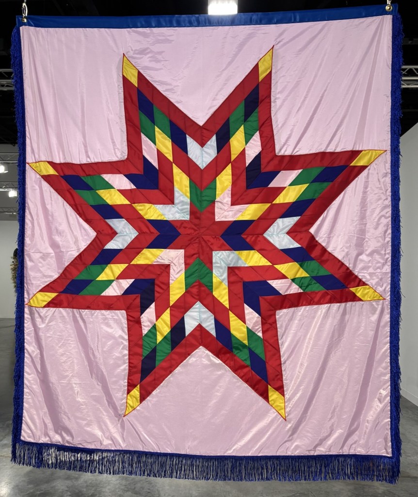 Apsaalooke contemporary multimedia artist, Wendy Red Star, took a traditional route with a star quilt. The start quilt is the essence of gift giving it shows the utmost respect, honor, and admiration of a person or family.