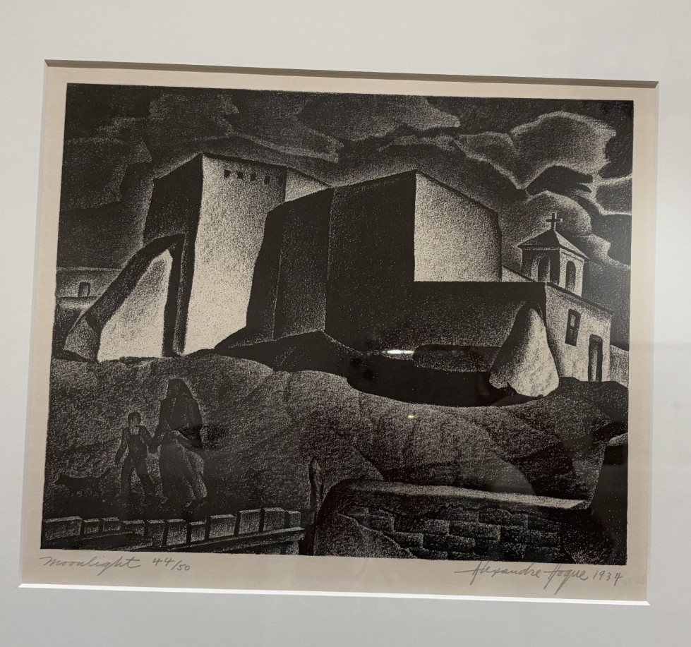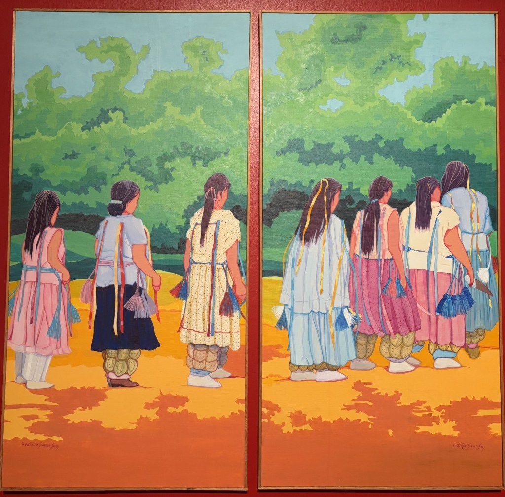 Slowly walking through the galleries, I remembered a meeting of some arts organization early in my stay in Tulsa. Ruthe Blalock Jones, at that time a professor of art at Bacone College, warmly greeted me, a long-time friendship followed. I finally bought one of her prints at the famous annual Indian Art Market in Santa Fe many years later. Ribbon Dance, her diptych in this exhibition, took me back to our many conversations as well as my work helping restore and revitalize the Creek Council House in Okmulgee, Oklahoma. Stomp dance and shell-shaking (see turtle shells around the girls’ ankles) is a tradition. Two sashes like the ones worn by the dancers are at my side on a file cabinet.